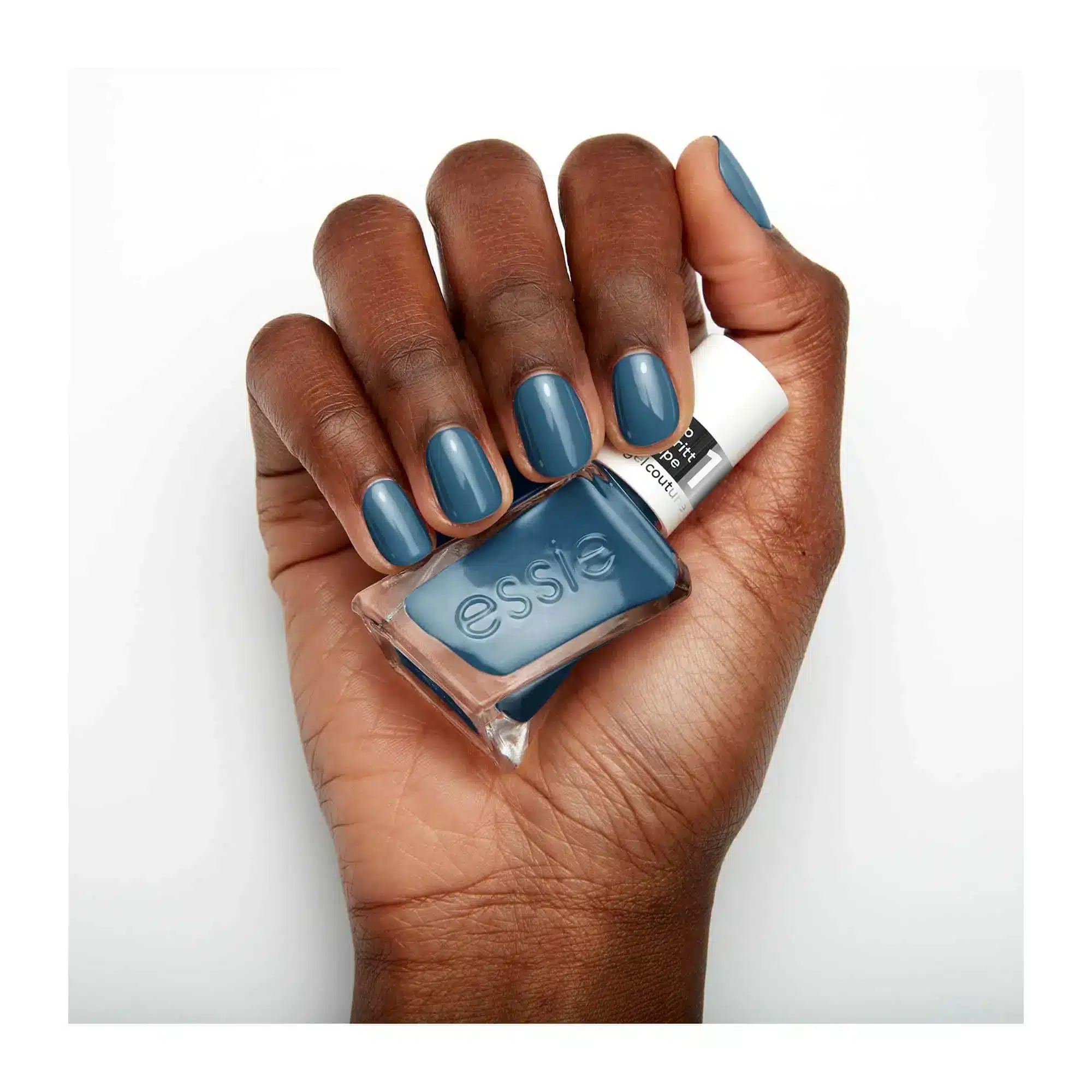 Εssie Gel Couture βερνίκι νυχιών για αποτέλεσμα σαν gel. Ένα μακράς διάρκειας, vegan βερνίκι νυχιών σε ένα μουντό μπλε χρώμα με γκρι και κίτρινους υποτόνους.