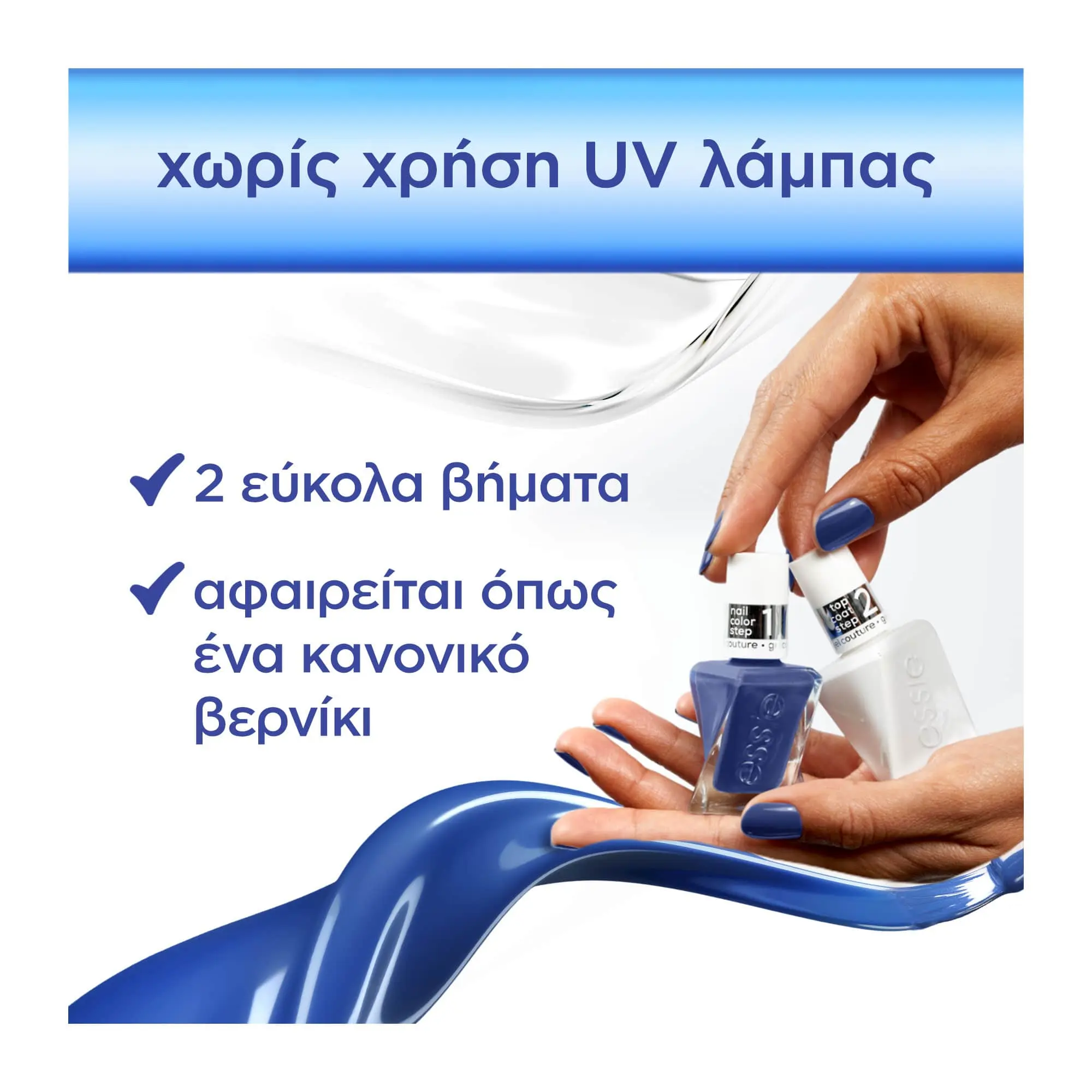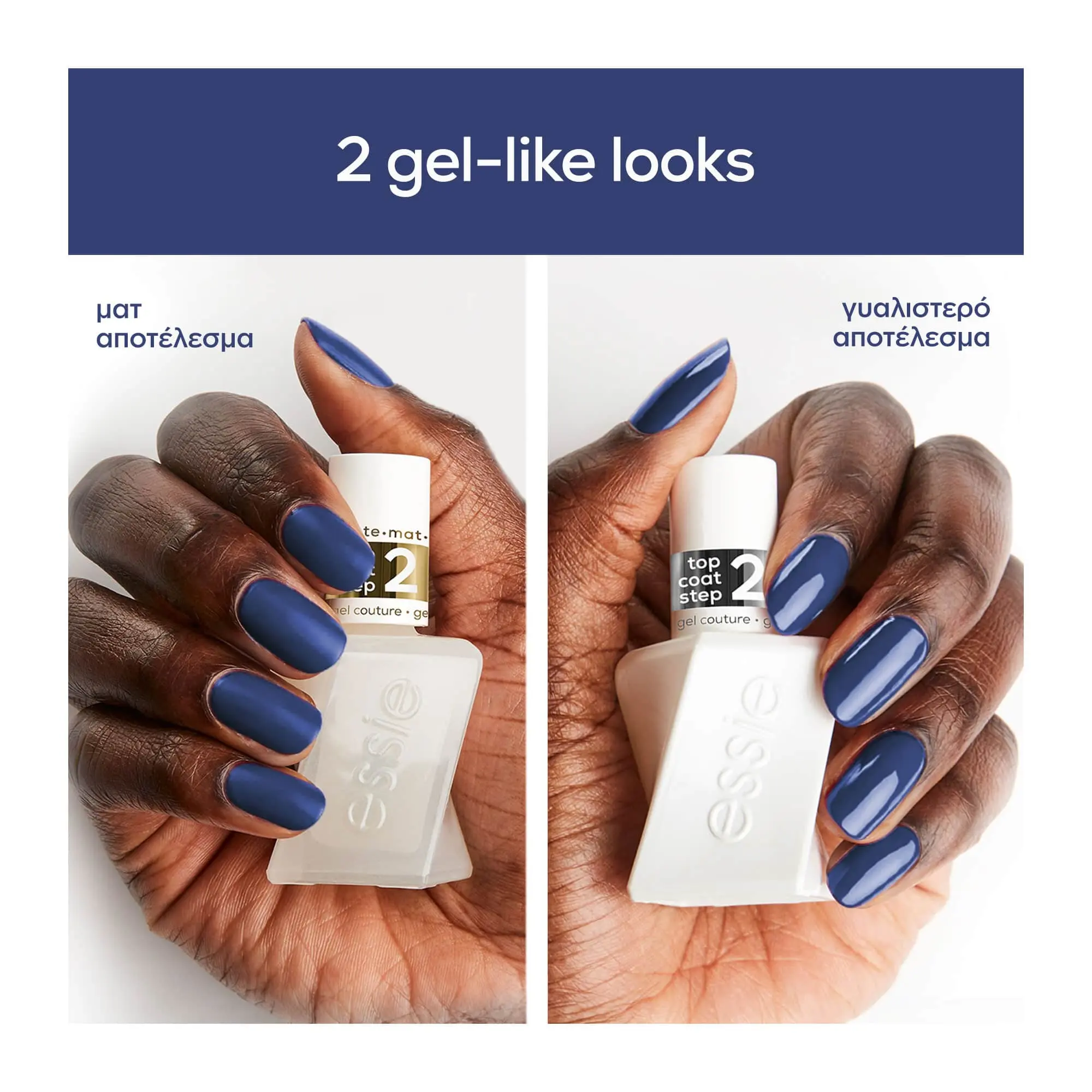 Το Gel Couture έχει ειδική τεχνολογία χάρη στην οποία δεν χρειάζεστε βάση. Εφάρμοσε δύο στρώσεις χρώματος gel couture essie. Ολοκλήρωσε με το ειδικό gel couture clear top coat για υγιή, έντονη λάμψη ή με το matte top coat για απαλό ματ βελούδινο φινίρισμα και πέτυχε αποτέλεσμα σαν gel, που διαρκεί έως και 15 μέρες.