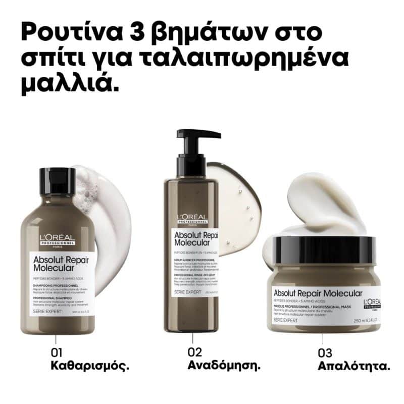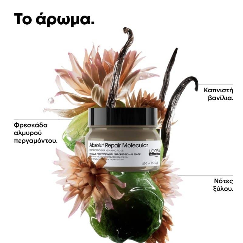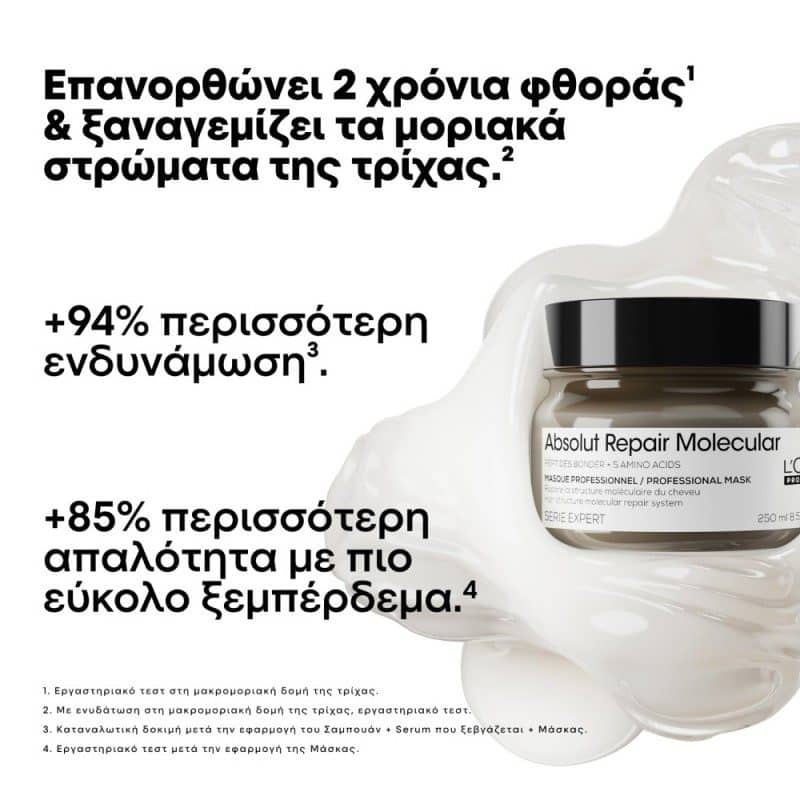 Συμπυκνωμένη Μάσκα, εμπλουτισμένη με 2% πεπτιδικούς δεσμούς + 5 αμινοξέα, επανορθώνει 2 χρόνια φθοράς και ξαναγεμίζει τα μοριακά στρώματα της τρίχας.