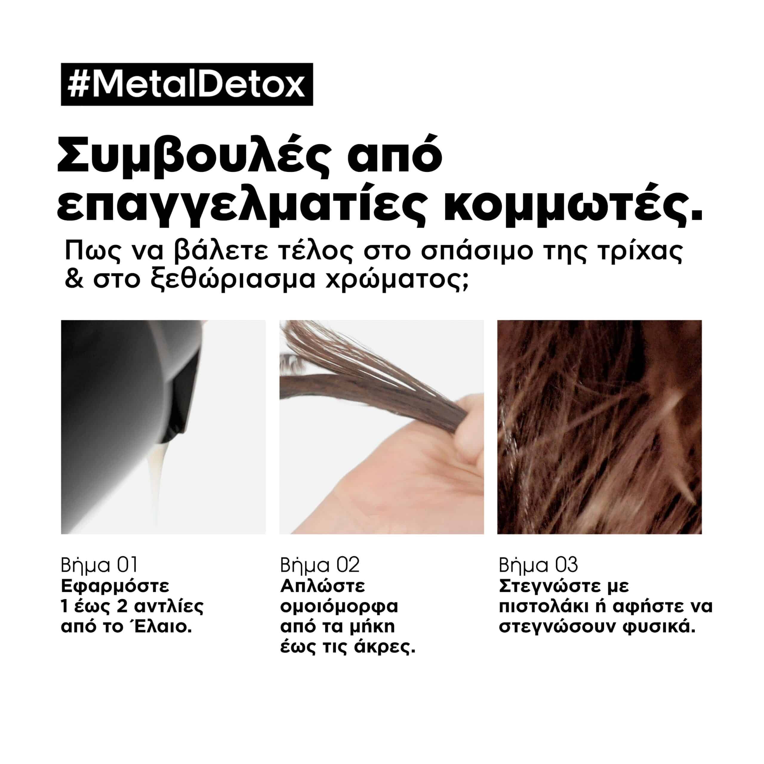 Το συμπυκνωμένο λάδι Metal Detox προστατεύει τα μαλλιά από την προσκόλληση μεταλλικών στοιχείων μετά τις υπηρεσίες βαφής, balayage και ξανοίγματος. Η συγκέντρωση των μεταλλικών στοιχείων στο εσωτερικό της τρίχας μπορεί να προκαλέσει σπάσιμο της τρίχας και να επηρεάσει αρνητικά το χρωματικό αποτέλεσμα στις υπηρεσίες βαφής, balayage και ξανοίγματος.