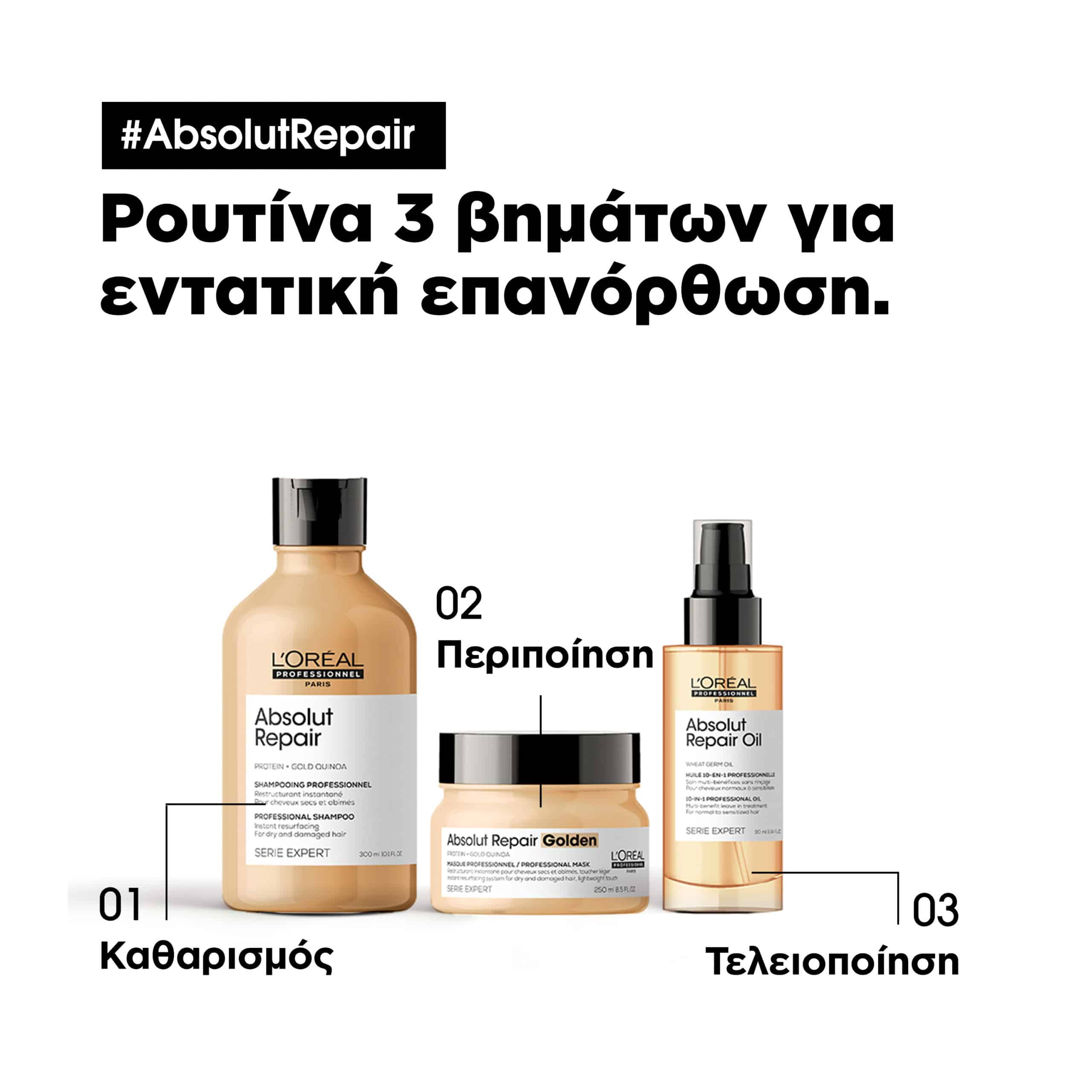 Σε συνδυασμό με τα Absolut Repair Conditioner, Masque ή Golden Masque, εξασφαλίζει στα μαλλιά λάμψη και λείανση.