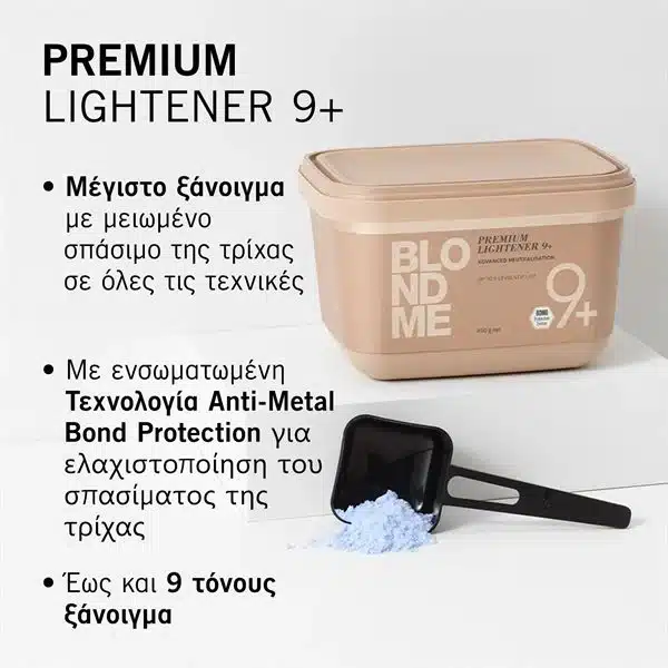 Το Schwarzkopf Professional BLONDME Premium Lightener 9+ είναι μια υπερ-ισχυρή ξανθυστική πούδρα που προσφέρει έως και 9 τόνους ξανοίγματος με μέγιστη προστασία της τρίχας. Εξασφαλίζει ομοιόμορφο, καθαρό αποτέλεσμα και ελαχιστοποιεί τη φθορά, χάρη στην Advanced Bonding Technology.