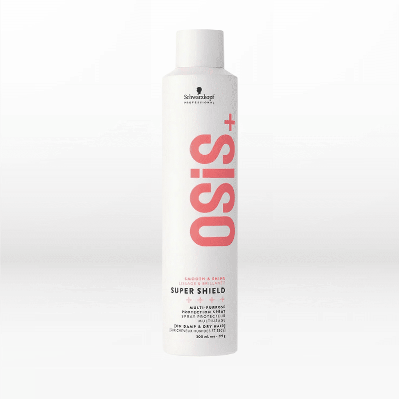 Spray προστασίας πολλαπλών χρήσεων για όλα τα μαλλιά. Το OSiS+ Super Shield 300ml προσφέρει προστασία από θερμότητα έως 230°C, αντι-υγρασία & αντι-ρύπανση δράση, εξουδετερώνει το φριζάρισμα και χαρίζει λάμψη — ιδανικό για μακριά ή δύσκολα στο χτένισμα μαλλιά.