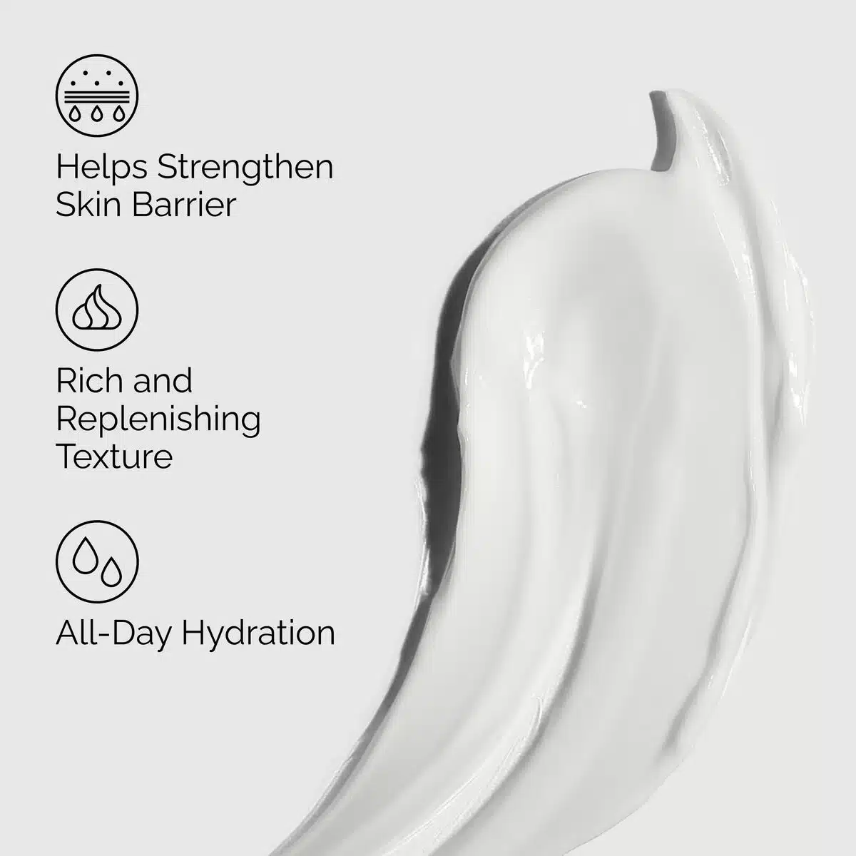 Θρεπτική ενυδατική κρέμα με Natural Moisturizing Factors + φυτοκεραμίδια, που ενισχύει άμεσα την ενυδάτωση, επανορθώνει τον δερματικό φραγμό και προσφέρει «γεμάτη», απαλή εμφάνιση. Κατάλληλη για χρήση πρωί και βράδυ.